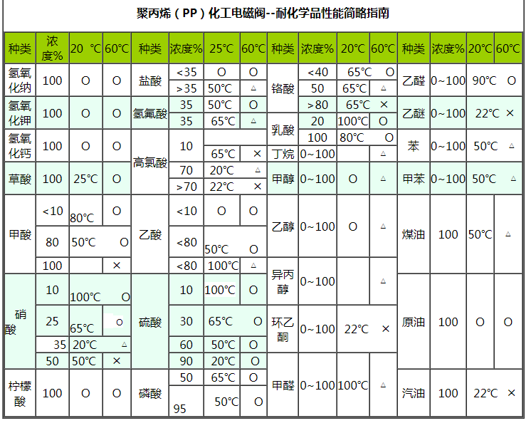 聚丙烯(PP)化工電磁閥具有優(yōu)良的耐腐蝕性能,在80℃下能耐除氧化性外的一般無機(jī)酸、堿、鹽、氣體、水等的腐蝕。它對極性有機(jī)溶劑和強(qiáng)極性的羧酸、醇類有較大的抗溶劑能力。少數(shù)氧化性酸在濃度較高時對其有較大的腐蝕作用。有一定的剛度和強(qiáng)度,適用溫度為-0~120℃。
