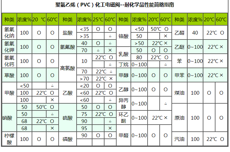 聚氯乙烯(PVC)化工電磁閥具有優(yōu)良的耐腐蝕性能,耐酸(包括稀硝酸)、堿、鹽、氣體、水等的腐蝕。對(duì)無(wú)極性的烷烴及強(qiáng)極性的羧酸、醇類(lèi)有較大的抗溶劑能力。少數(shù)氧化性酸在濃度較高時(shí)對(duì)其有較大的腐蝕作用。有一定的剛度和強(qiáng)度,適用溫度為-0~60℃。